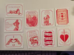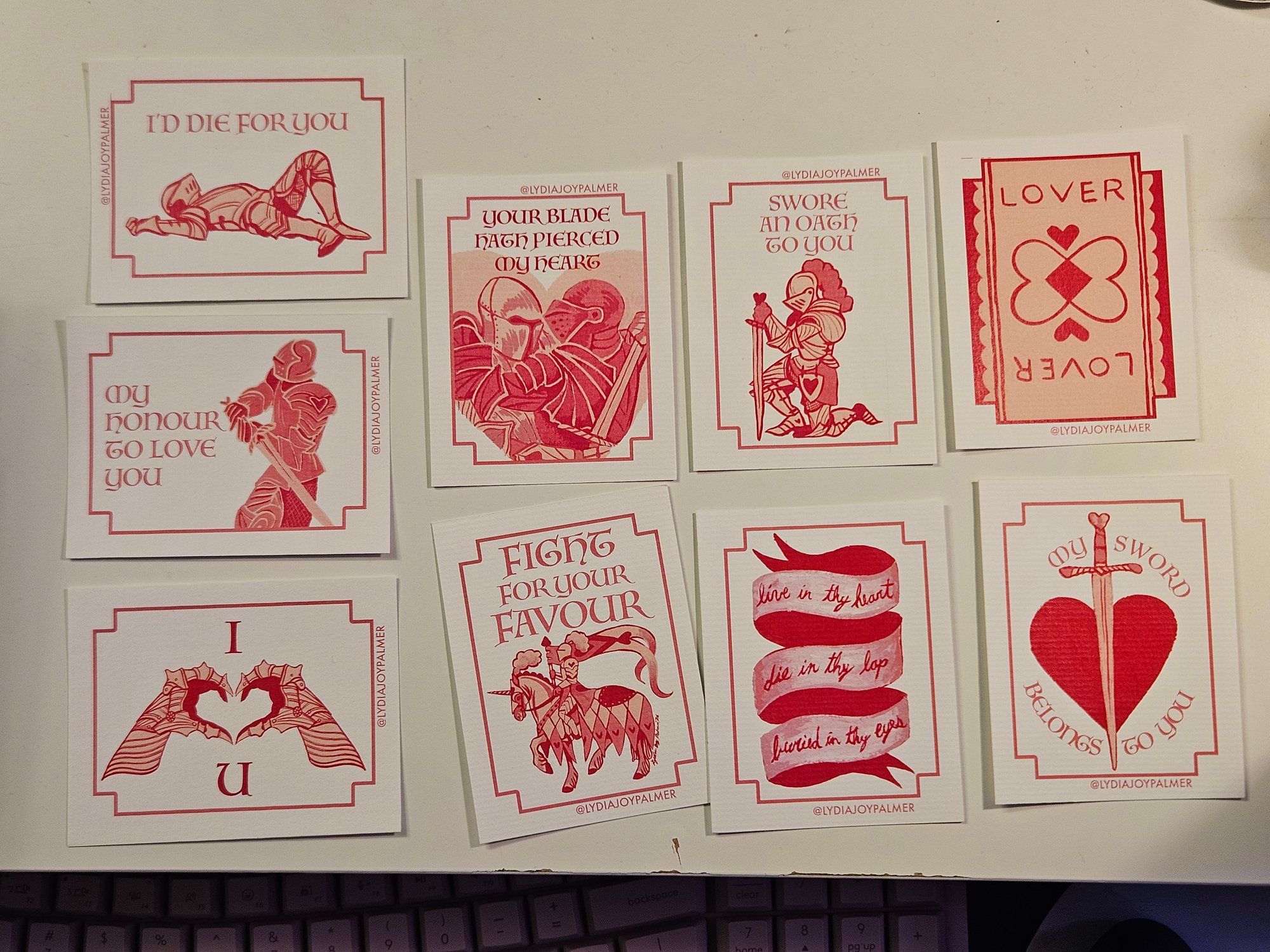 Romantic silly knight valentines, present them to your darling <3 Nine individual cards, each card is roughly 2.5x3.5in, printed on linen cardstock.